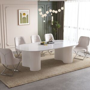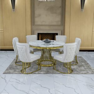 This elegant dining set features a premium marble-finish tabletop paired with a striking gold stainless-steel base. Completed with plush velvet chairs and refined gold accents, it brings a bold yet sophisticated statement to any modern dining space.